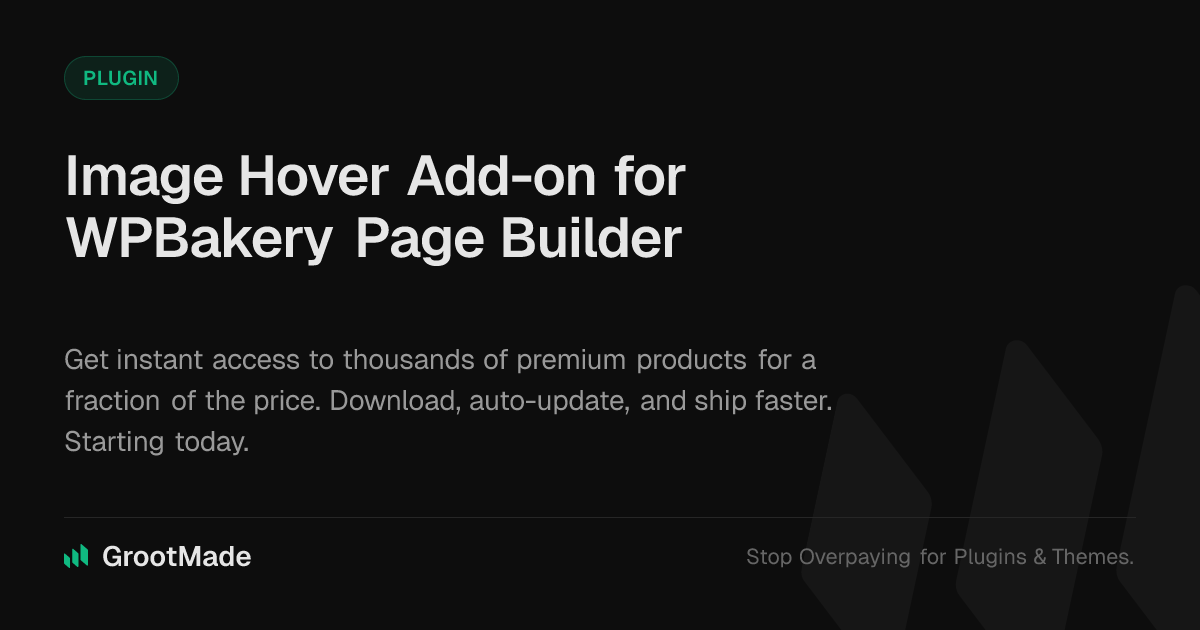 GrootMade is NOT affiliated with Image Hover Add-on for WPBakery Page Builder or its original author. Image Hover Add-on for WPBakery Page Builder™ is a trademark of its respective owner and use of it does not imply any endorsement or affiliation. This product has been forked under the GNU General Public License (GPL) and all non-GPL assets (such as proprietary images, fonts, and branding) have been removed. Distributing GPL-licensed code is 100% legal.