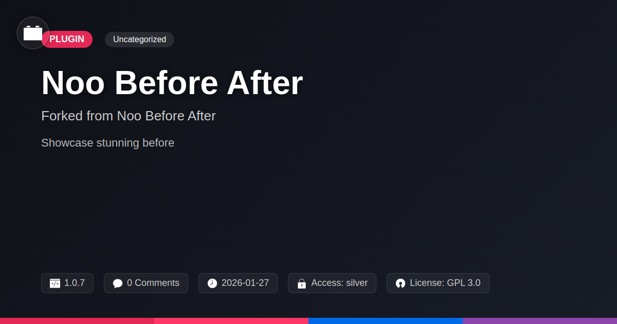 GrootMade is NOT affiliated with Noo Before After or its original author. Noo Before After™ is a trademark of its respective owner and use of it does not imply any endorsement or affiliation. This product has been forked under the GNU General Public License (GPL) and all non-GPL assets (such as proprietary images, fonts, and branding) have been removed. Distributing GPL-licensed code is 100% legal.