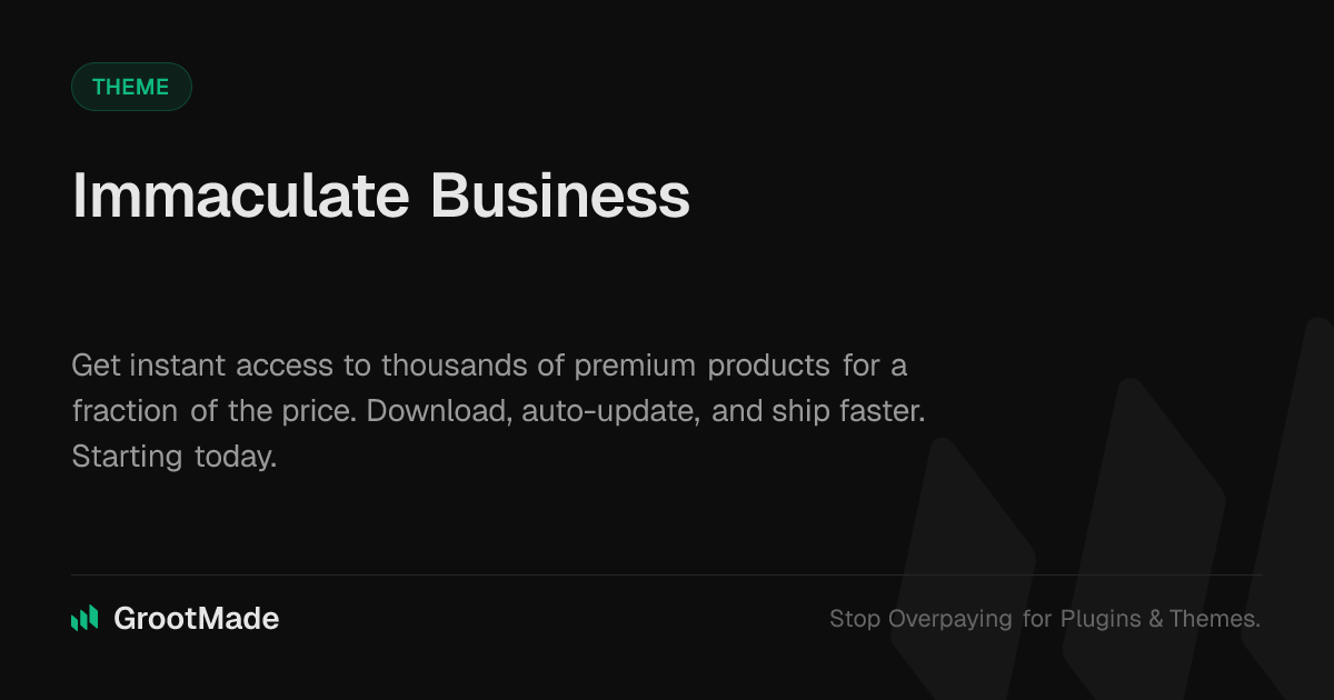 GrootMade is NOT affiliated with Immaculate Business or its original author. Immaculate Business™ is a trademark of its respective owner and use of it does not imply any endorsement or affiliation. This product has been forked under the GNU General Public License (GPL) and all non-GPL assets (such as proprietary images, fonts, and branding) have been removed. Distributing GPL-licensed code is 100% legal.