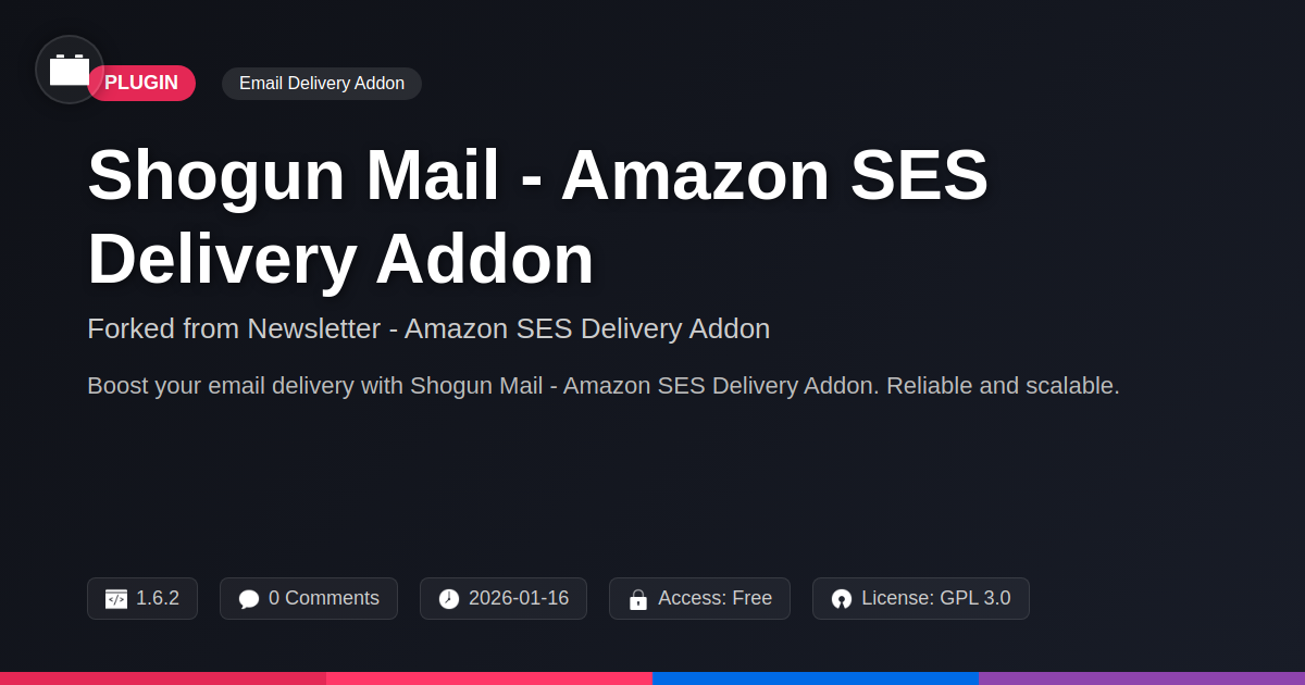 Tired of emails playing hide-and-seek? Meet your new ally. This addon is your knight in shining armor. It's also a stealthy ninja. It ensures your messages always land where they should. Think of it as a super-smart mailman. It’s built on a rock-solid foundation. It’s a project that was forked with great care. This means it’s had a lot of attention. It’s powered by a leading messaging engine. This engine is known for its scale and efficiency. It's also very kind to your budget. Shogun Mail acts as your sophisticated messenger. It gets your communications delivered reliably. It ensures they arrive on time. Your recipients get them in the right place. Developers appreciate its no-nonsense approach. It means fewer headaches for you. It's built for robustness. It’s designed for pure efficiency. This is the solution your sending needs.