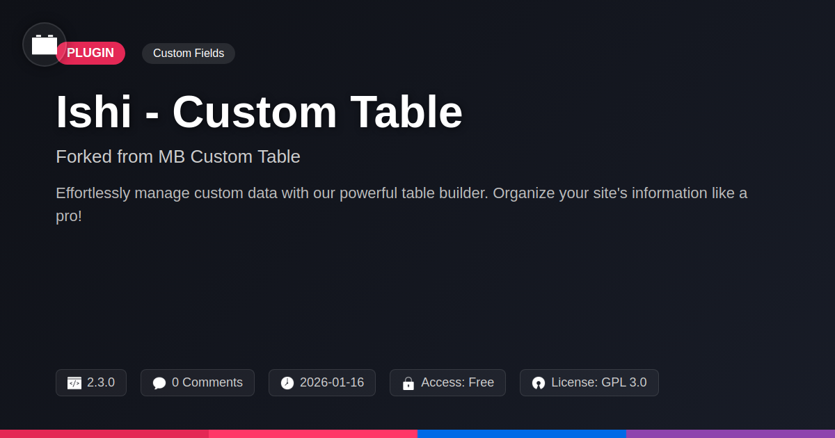 So, there you have it. Ishi - Custom Table: the ultimate upgrade for anyone who’s ever stared at a baffling array of data and thought, "There has to be a better way." We’ve taken a robust foundation and infused it with a spirit of pragmatic ingenuity, designed to keep your workflow from devolving into a digital circus sideshow. Whether you're a solo developer crafting intricate client solutions, an agency looking to streamline your custom projects, or just an open-source enthusiast who appreciates elegantly engineered tools, Ishi is here to make your life easier. Forget the days of convoluted workarounds and the sheer auditory agony of debugging poorly structured data. With Ishi, you’re not just getting a plugin; you’re gaining a powerful ally in the quest for organized, efficient, and downright beautiful data management. It's about giving you the reins, letting you dictate how your databehaves, not the other way around. So, go ahead, dive in, experiment, and build something amazing. We’re pretty sure you’ll wonder how you ever managed without it. Now, if you'll excuse us, we've got some more data to wrangle – and maybe a celebratory beverage to enjoy.