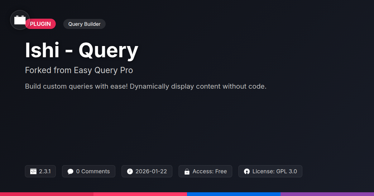 So there you have it. Ishi - Query isn't just another plugin; it's a declaration of independence for developers and agencies tired of being hamstrung by inadequate data retrieval tools. It’s about reclaiming control, wielding the power of precise queries without resorting to obscure incantations or proprietary black boxes. For those who appreciate the elegance of well-structured data and the freedom of open-source, this tool is a revelation. It’s the culmination of a proven legacy, enhanced and offered with the spirit of collaboration that defines the best of the development community. Whether you’re building a complex client portal that needs to pull data from a dozen different custom sources, or a personal project that demands a highly tailored content display, Ishi - Query provides the robust foundation you need. Forget the limitations and embrace the possibilities. It's time to stop wrestling with your data and start making it work for you, efficiently, intelligently, and with the full flexibility that only a well-crafted, open-source solution can offer. So, dive in, experiment, and discover just how much cleaner and more powerful your data management can be.