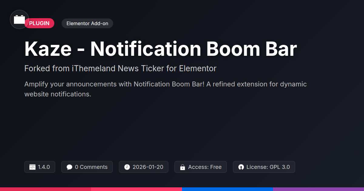 So, there you have it. Kaze - Notification Boom Bar, a tool forged from a desire for something better, something more impactful, and something that doesn't require a Ph.D. in advanced CSS to implement. If you’ve ever stared blankly at your screen, wondering how to get that crucial piece of information to stick in your visitor's brain without resorting to obnoxious pop-ups, then this is your digital cavalry. It’s for the developers who appreciate elegant code, the agencies who need to deliver polished results, and the open-source evangelists who understand the power of shared innovation. No more blending into the background like a beige sock at a disco. This is about making a statement, delivering value, and doing it all with a flair that’s both professional and, dare we say, a little bit fun. We’ve seen the pain points, and we’ve built a solution that addresses them head-on, inheriting the strengths of its lineage and presenting them in a package that’s ready for action. It’s proof that sometimes, the best solutions come from taking something great and making it even more accessible, more customizable, and more undeniably useful. Stop letting your important messages go unheard. It’s time to make some noise, the right kind of noise, with Kaze - Notification Boom Bar.