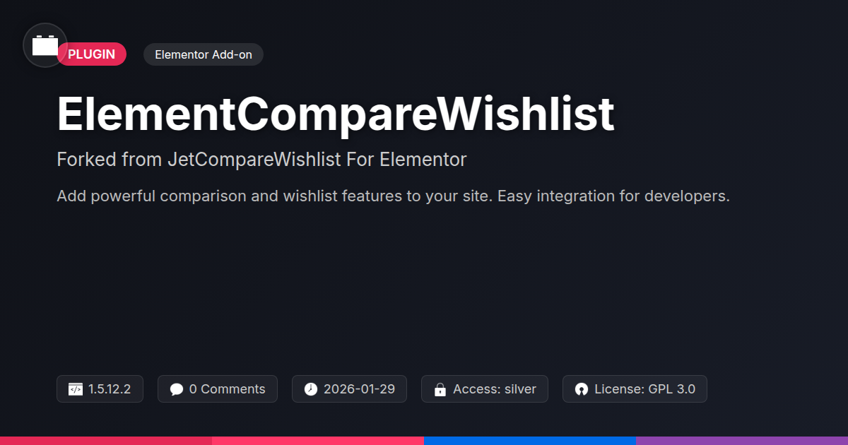 GrootMade is NOT affiliated with JetCompareWishlist For Elementor or its original author. JetCompareWishlist For Elementor™ is a trademark of its respective owner and use of it does not imply any endorsement or affiliation. This product has been forked under the GNU General Public License (GPL) and all non-GPL assets (such as proprietary images, fonts, and branding) have been removed. Distributing GPL-licensed code is 100% legal.