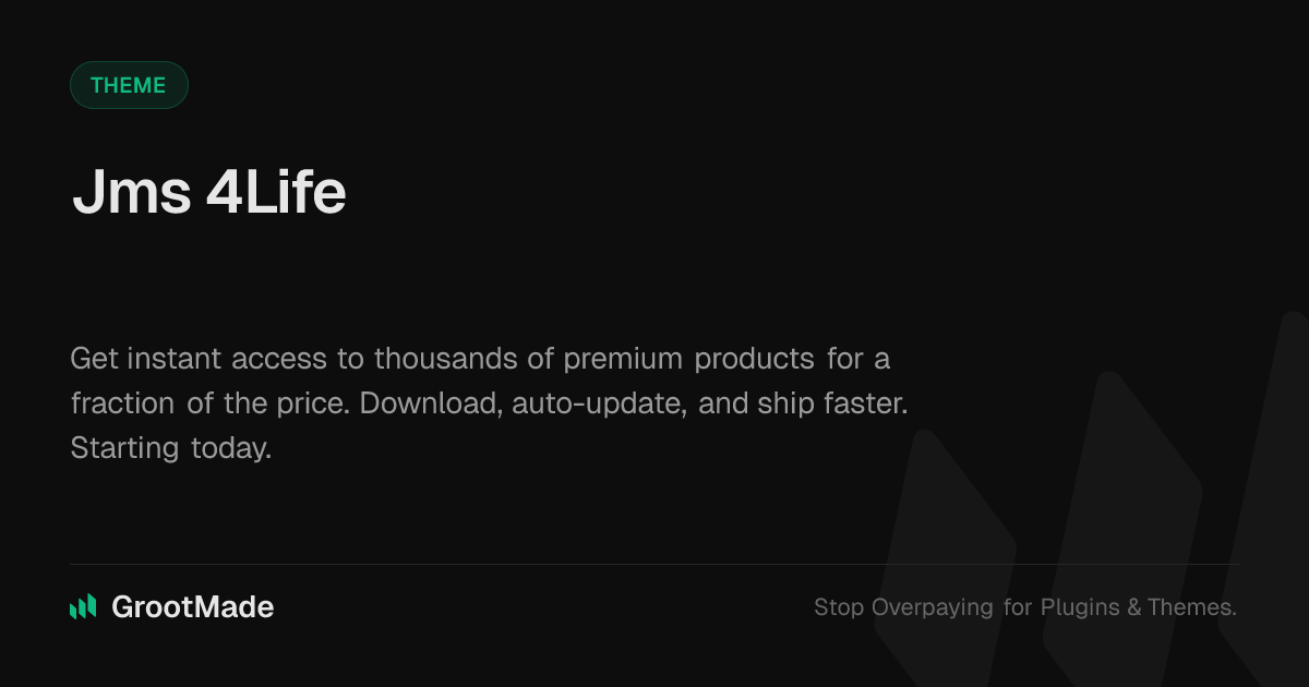 GrootMade is NOT affiliated with Jms 4Life or its original author. Jms 4Life™ is a trademark of its respective owner and use of it does not imply any endorsement or affiliation. This product has been forked under the GNU General Public License (GPL) and all non-GPL assets (such as proprietary images, fonts, and branding) have been removed. Distributing GPL-licensed code is 100% legal.