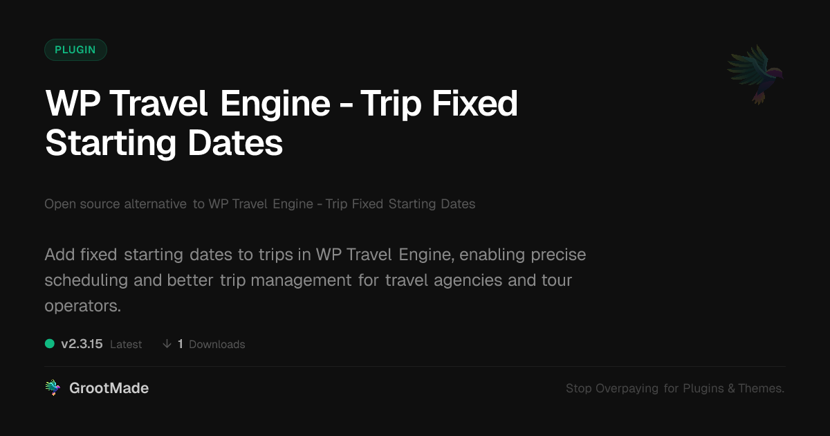 GrootMade is NOT affiliated with WP Travel Engine - Trip Fixed Starting Dates or its original author. WP Travel Engine - Trip Fixed Starting Dates™ is a trademark of its respective owner and use of it does not imply any endorsement or affiliation. This product has been forked under the GNU General Public License (GPL) and all non-GPL assets (such as proprietary images, fonts, and branding) have been removed. Distributing GPL-licensed code is 100% legal.
