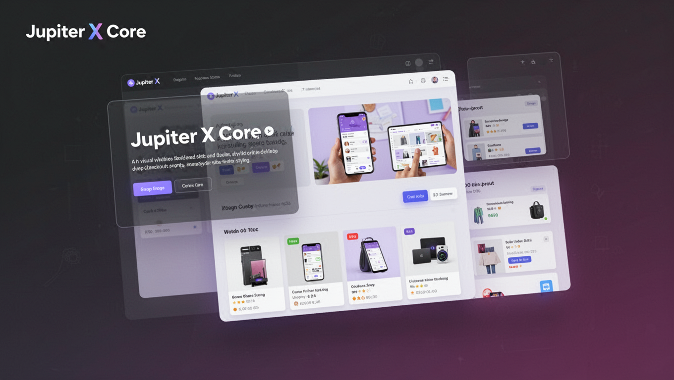 Jupiter X is a visual website building system designed for creating custom online stores, business sites, and portfolios. It is built for users who want detailed control over their site's design and e-commerce functionality without writing code. The system integrates with a popular page builder to provide a live editing canvas.