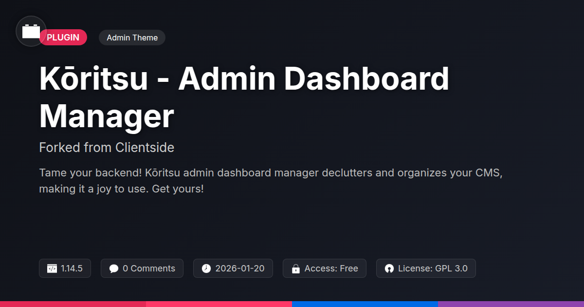 So, there you have it – Kōritsu - Admin Dashboard Manager. It’s the digital equivalent of finally cleaning out that junk drawer that’s been bothering you for years. You know the one. It’s piled high with old batteries, mysterious cables, and probably a stray button that doesn't belong to anything. Our tool is here to help you declutter that digital junk drawer, making your backend a space you actually want to work in. We're not saying it’s going to make writing code as fun as a trip to Disneyland, but it’s a darn good start. Think of it as your personal admin assistant, except it doesn’t ask for coffee breaks or steal your stapler. It’s designed by people who understand the pain of a bloated, confusing interface – much like the original inspiration, this fork aims to bring sanity back into your daily grind. For developers tired of digging through nested menus, for agencies wanting to present a clean face to clients (even if it’s just the backend), and for all you open-source aficionados who appreciate a well-crafted, community-driven solution, Kōritsu is your new best friend. It’s about reclaiming your time, reducing frustration, and ultimately, getting more done with less fuss. Stop wrestling with your content management system and start wrangling it. Give Kōritsu a whirl and experience the sweet, sweet relief of an organized, efficient, and dare we say, enjoyable admin experience. Your sanity will thank you, and who knows, you might even start to appreciate your backend again. Maybe.