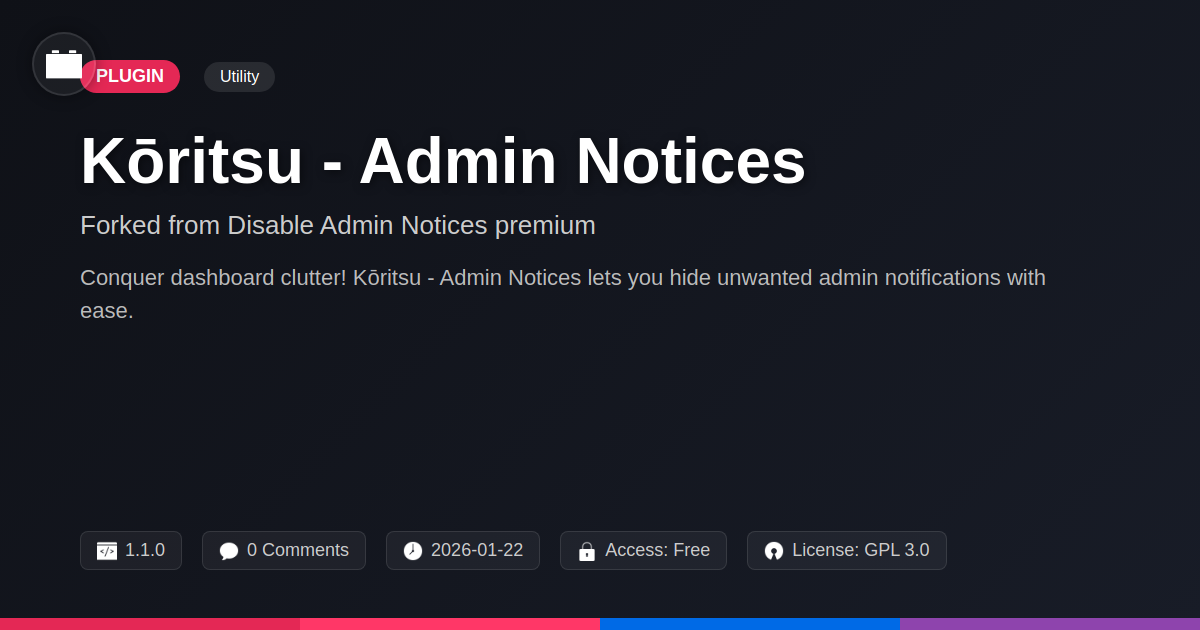 Are you tired of your administrative dashboard looking like a digital fire sale, with a constant barrage of pop-ups, alerts, and status updates screaming for your attention? As a seasoned developer, agency owner, or perhaps a purist who cherishes the elegant simplicity of open-source, you understand the value of a clean, focused workspace. You’re not here to be nagged by every plugin or theme creator about their latest update, a minor warning that could be an email, or some obscure notification that’s utterly irrelevant to your immediate tasks. This digital cacophony not only looks messy but actively hinders productivity. It's the digital equivalent of someone constantly tapping you on the shoulder while you're trying to concentrate. We get it. That’s why tools designed to bring order to this chaos, to reclaim your sanity and your screen real estate, are invaluable. Enter Kōritsu - Admin Notices, a fork meticulously crafted for those who demand control over their digital environment. This isn't about hiding critical information; it's about surgically removing the noise so you can hear the signals that truly matter. It’s about bringing back the zen to your backend.