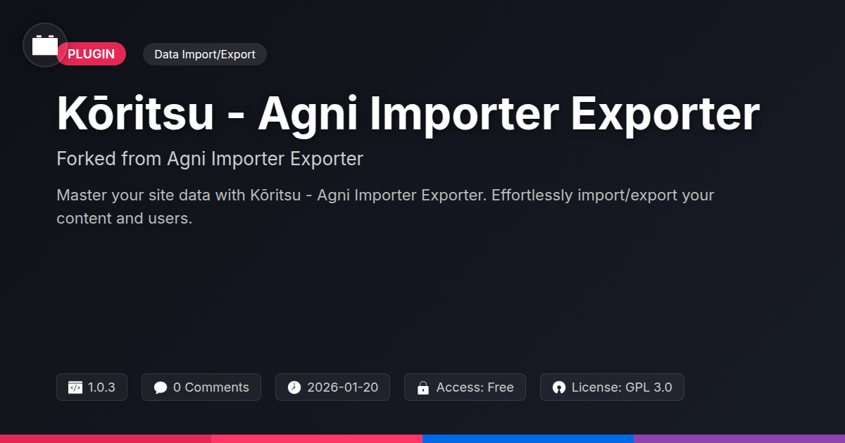 Tired of wrestling with data migration on your content management system? Do you ever feel like moving entire sites or large chunks of content is akin to herding cats through a laser grid? If you're nodding along, muttering about missing fields and scrambled formatting, then you're in the right place. We've all been there, staring at error logs that look like ancient hieroglyphics, wondering if there's a simpler way. What if you could move your precious data – posts, users, custom fields, the whole shebang – without breaking out in a sweat? For years, the original import/export tool was a go-to for many. But as the digital landscape evolves, so do the needs of developers and agencies. Enter Kōritsu - Agni Importer Exporter, a fork built with the spirit of open-source collaboration and a dash of innovation. This isn't just another import/export tool; it's a refined, community-driven solution designed to make your data wrangling woes a thing of the past. We're talking about precision, flexibility, and a workflow that might just make you hum a little tune while you work. Think of it as the upgrade your data migration process didn't know it desperately needed, offering a breath of fresh air in a space often choked by outdated functionality.