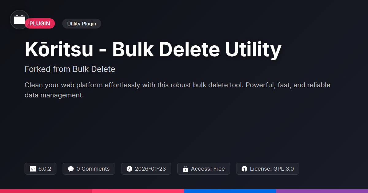 So, there you have it. Kōritsu - Bulk Delete Utility, the digital equivalent of a power wash for your website's underbelly. You’ve seen how it tackles the mountains of digital detritus that bog down performance and silently gnaw at your site's security. For developers who are constantly chasing deadlines, for agencies striving to deliver pristine, performant websites that clients love, and for the unsung heroes of the open-source world who appreciate a tool built with care and community in mind, this utility is more than just a plugin; it's a sanity saver. It’s the difference between spending your weekends wrestling with tedious manual cleanups and actually enjoying your free time, perhaps doing something more rewarding, like… well, anything else.