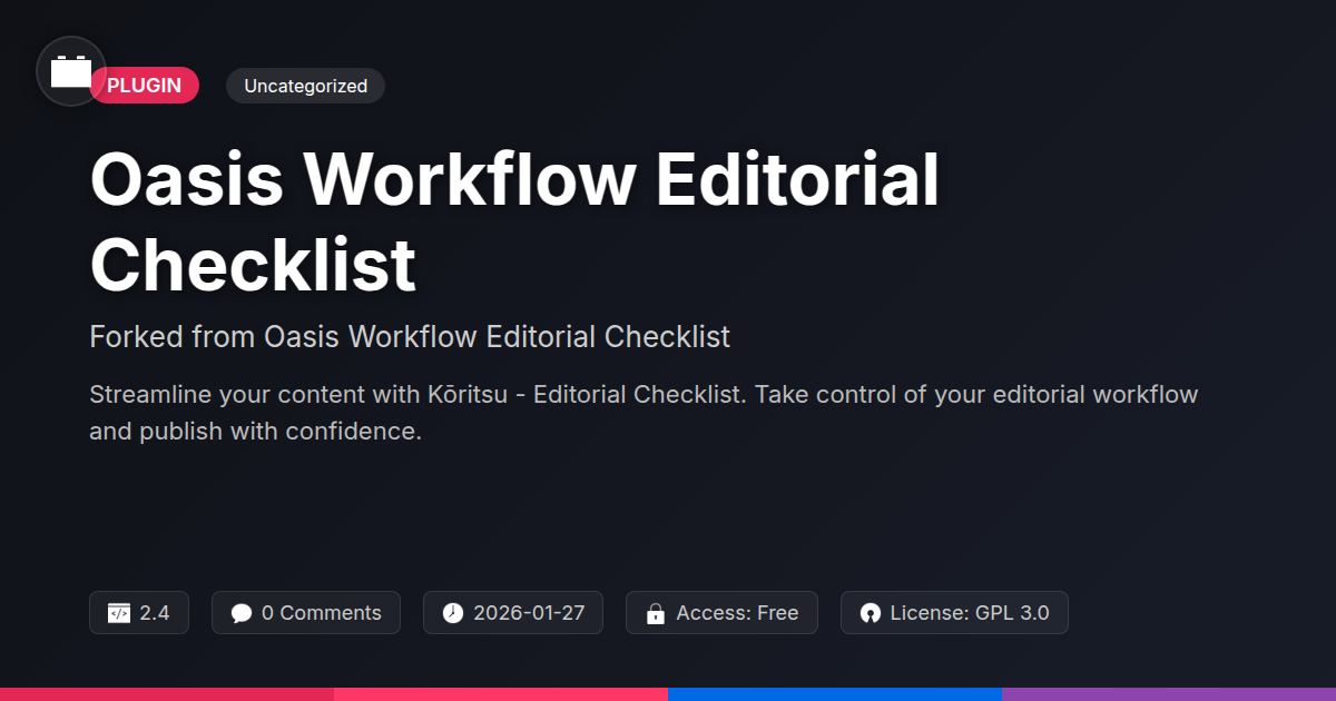 GrootMade is NOT affiliated with Oasis Workflow Editorial Checklist or its original author. Oasis Workflow Editorial Checklist™ is a trademark of its respective owner and use of it does not imply any endorsement or affiliation. This product has been forked under the GNU General Public License (GPL) and all non-GPL assets (such as proprietary images, fonts, and branding) have been removed. Distributing GPL-licensed code is 100% legal.