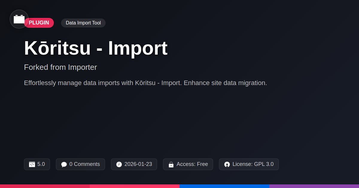 But fret not, weary traveler! Kōritsu - Import emerges from this chaos not as another clunky solution, but as a beacon of hope, fortified by the relentless spirit of open-source. It’s the culmination of everything we’ve learned, a testament to the fact that robust functionality and user-friendliness can, in fact, be friends. This isn’t just another plugin; it’s a meticulously crafted instrument designed to bring order to your digital universe. It’s for the code warriors, the design wranglers, and the open-source evangelists who demand excellence without the corporate jargon. Think of it as your digital Swiss Army knife, ready to slice through any data challenge with precision and a healthy dose of sass.