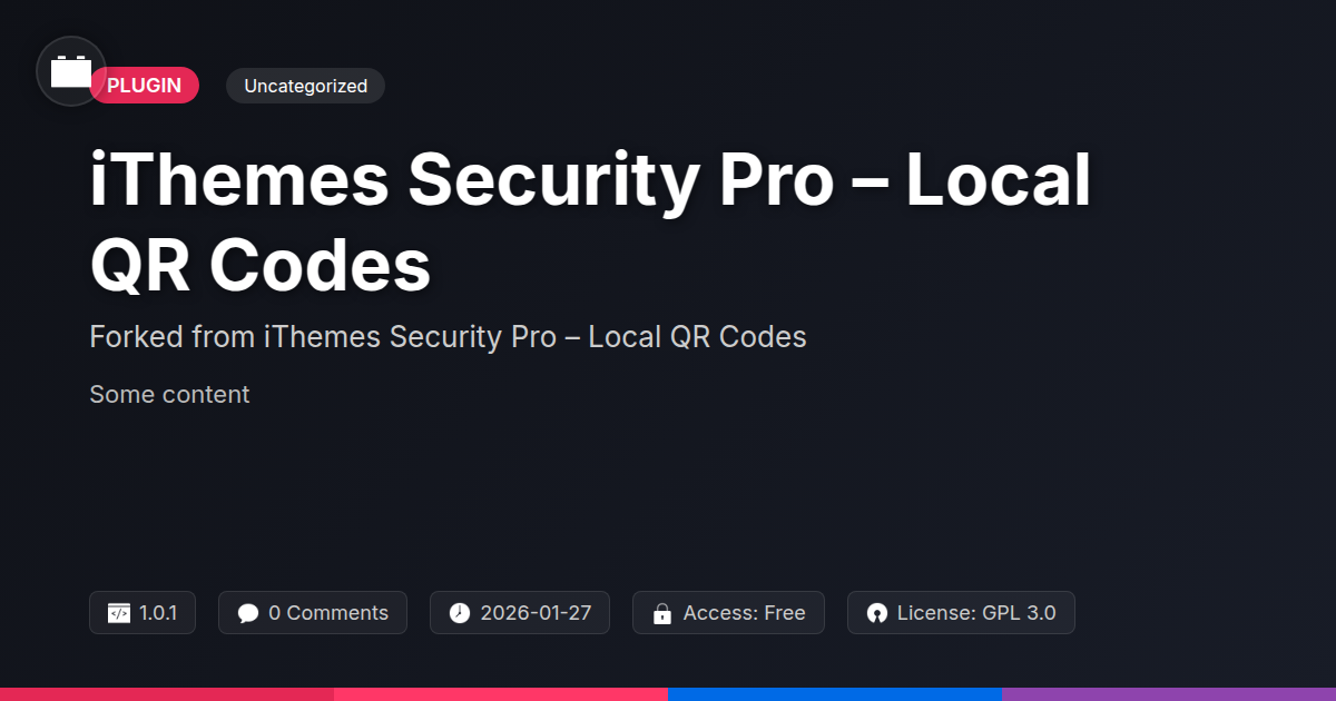GrootMade is NOT affiliated with iThemes Security Pro – Local QR Codes or its original author. iThemes Security Pro – Local QR Codes™ is a trademark of its respective owner and use of it does not imply any endorsement or affiliation. This product has been forked under the GNU General Public License (GPL) and all non-GPL assets (such as proprietary images, fonts, and branding) have been removed. Distributing GPL-licensed code is 100% legal.
