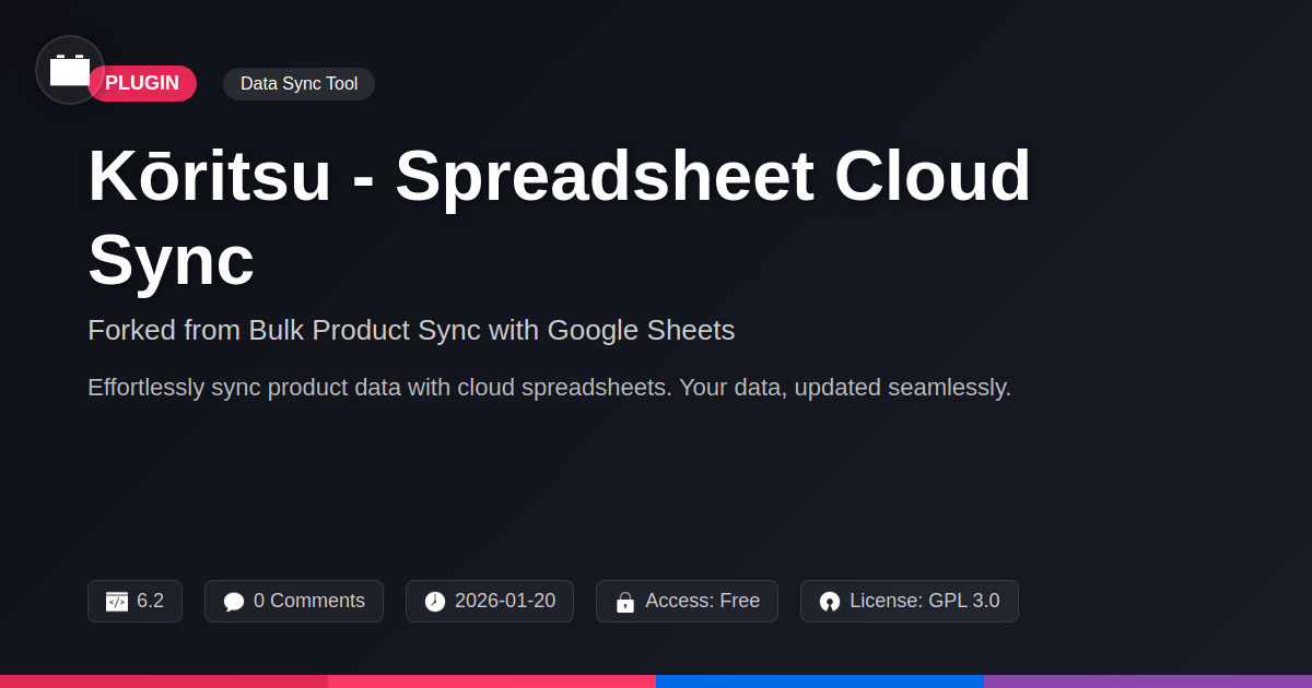So, there you have it. If you've ever found yourself questioning your life choices while staring at a spreadsheet filled with product data, Kōritsu - Spreadsheet Cloud Sync is here to throw you a digital life raft. We’ve taken a solid, open-source foundation and polished it to a shine, specifically for WordPress developers, agencies, and anyone who appreciates a tool that just works. No more manual drudgery, no more heart-stopping sync errors. Just smooth, seamless integration between your product lists and your online store, powered by the magic of the cloud. This isn't just another plugin; it's a sanity saver, a time machine for your workflow, and frankly, a pretty decent companion for navigating the often-treacherous waters of e-commerce data management. Imagine easily updating thousands of products with just a few clicks, or having your entire inventory perfectly synchronized without breaking a sweat. That's the promise of Kōritsu. By forking from a proven solution, we’ve ensured stability and reliability while adding modern cloud sync capabilities and a user experience that won't make you want to throw your computer out the window. It’s about giving you back control, maximizing efficiency, and letting you focus on what you do best: building awesome online experiences. So, if you're ready to ditch the data-entry drama and embrace a smarter, more streamlined approach, Kōritsu is waiting.