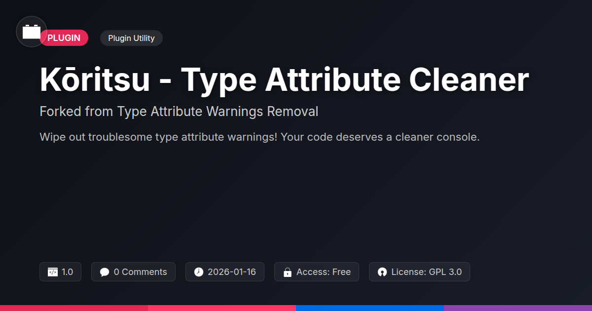 So, there you have it. That lingering digital smog in your browser console, the one that makes you question your sanity and artistic choices? It’s time to clear the air. Kōritsu - Type Attribute Cleaner isn't just about removing a few lines of text; it’s about reclaiming your focus, streamlining your workflow, and maintaining the professional edge that separates the good from the truly great in the digital realm. We’ve all been there, squinting at endless streams of warnings, wondering if they’re shouting about a genuine catastrophe or just a misplaced comma. Kōritsu strips away that noise, offering you a pristine development environment where you can actually see the forest for the trees – the trees being your brilliant code, of course. For the agency owners, this means cleaner deliverables and a smoother team experience. For the solo developers, it’s about reducing unnecessary friction and making your coding sessions more productive (and perhaps less reliant on industrial-strength coffee). And for our beloved open-source community, it represents the evolution of solid work, a testament to how great ideas can be built upon and improved for everyone. It’s a small plugin with a big impact, ensuring that you’re not just building websites, but building with clarity and confidence. So go ahead, install Kōritsu, and give your development console the spa treatment it deserves. Your sanity will thank you.