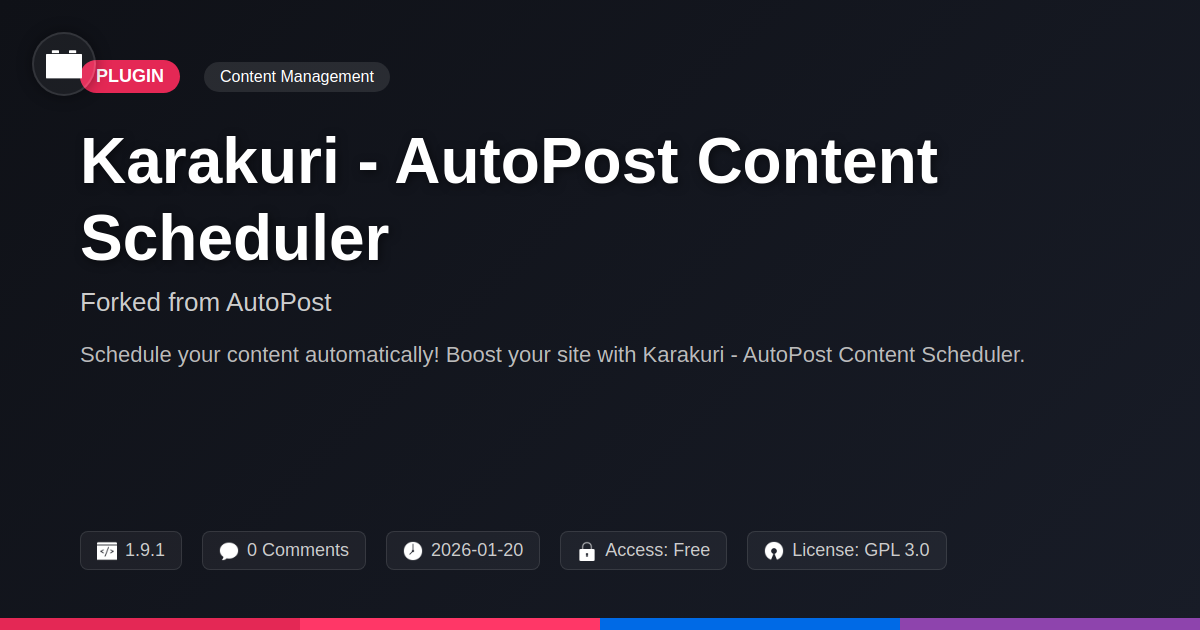 Tired of playing whack-a-mole with your content calendar? We feel you. Remember that exciting dev sprint? Now imagine debugging why that strategically placed article didn't actually appear. Yeah. Meet Karakuri. It's the digital butler you’ve always wanted, but more importantly, the one you deserve. Born from a solid foundation, Karakuri takes the reins of your scheduled posts. Think of it as your open-source cron job on steroids. It’s not just about hitting publish; it’s about precision. It’s about liberating your precious brain cycles from the tyranny of repetitive tasks. Your content, your schedule, no more frantic late-night logins. It just… works. Like a well-oiled Kubernetes cluster, but for your words and images. Finally, a tool that understands that your time is better spent architecting the next big thing, not babysitting a 'publish' button.