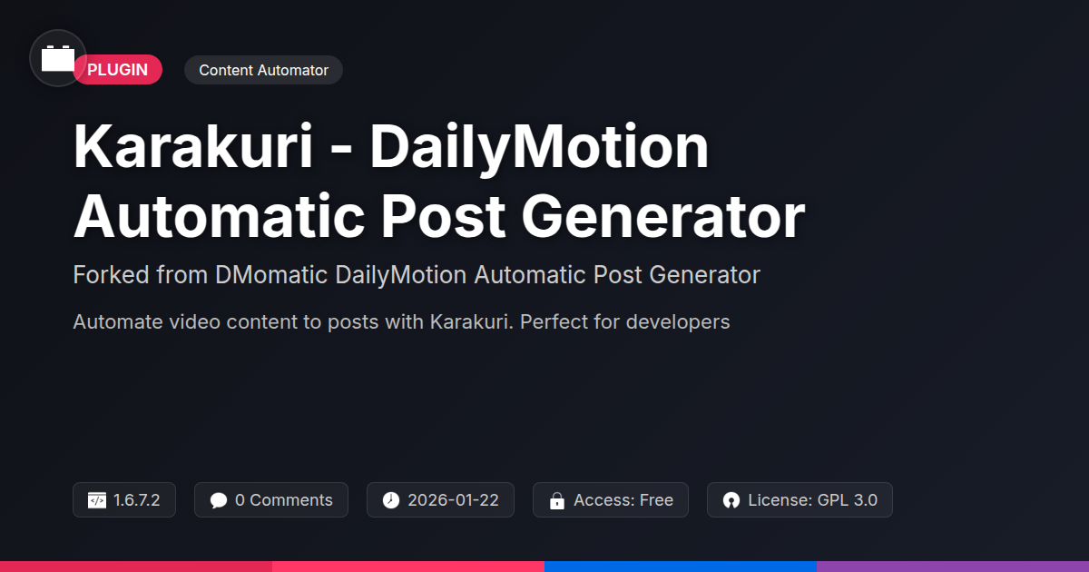 GrootMade is NOT affiliated with DMomatic DailyMotion Automatic Post Generator or its original author. DMomatic DailyMotion Automatic Post Generator™ is a trademark of its respective owner and use of it does not imply any endorsement or affiliation. This product has been forked under the GNU General Public License (GPL) and all non-GPL assets (such as proprietary images, fonts, and branding) have been removed. Distributing GPL-licensed code is 100% legal.