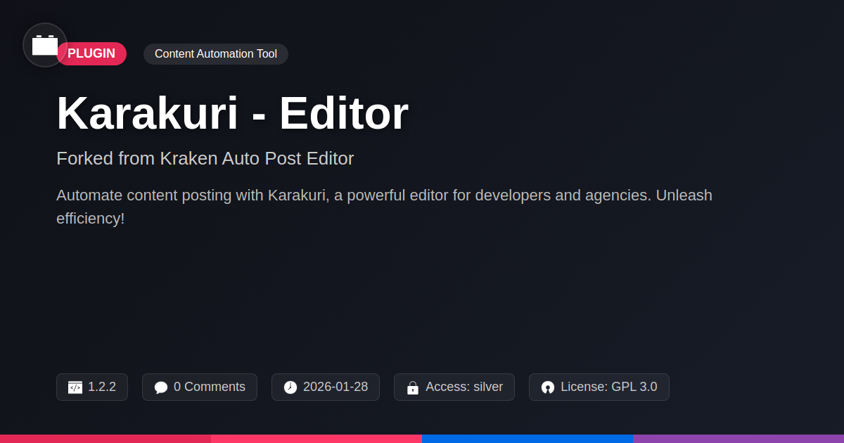 GrootMade is NOT affiliated with Kraken Auto Post Editor or its original author. Kraken Auto Post Editor™ is a trademark of its respective owner and use of it does not imply any endorsement or affiliation. This product has been forked under the GNU General Public License (GPL) and all non-GPL assets (such as proprietary images, fonts, and branding) have been removed. Distributing GPL-licensed code is 100% legal.