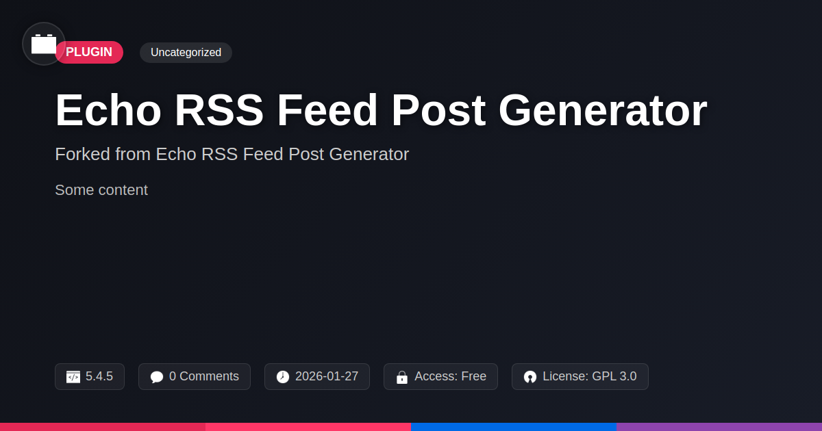 GrootMade is NOT affiliated with Echo RSS Feed Post Generator or its original author. Echo RSS Feed Post Generator™ is a trademark of its respective owner and use of it does not imply any endorsement or affiliation. This product has been forked under the GNU General Public License (GPL) and all non-GPL assets (such as proprietary images, fonts, and branding) have been removed. Distributing GPL-licensed code is 100% legal.