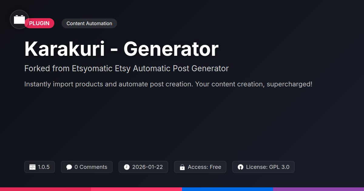 So, there you have it. You've journeyed through the somewhat bleak, yet hilariously relatable, landscape of manual product population, and emerged into the radiant, time-saving glow of Karakuri - Generator. Let's be honest, who enjoys spending their days meticulously copying and pasting product details until their eyes blur and their fingers cramp? Not you, that's for sure. As a seasoned developer or a savvy agency, your talent is far too valuable for such soul-crushing monotony. This is where Karakuri - Generator steps in, not as another piece of bloatware, but as a finely tuned instrument designed to liberate you from the shackles of repetitive labor. Think of it as your digital intern, one who's incredibly efficient, remarkably accurate, and never asks for coffee breaks. It’s the distilled essence of what made automated content posting so compelling, now distilled further, refined, and ready to integrate seamlessly into your workflow. We’ve seen how it can transform tedious tasks into automated successes, how it empowers you to manage more projects, cater to more clients, and, crucially, reclaim those precious hours you’ve been losing to the abyss of manual entry. It’s about working smarter, not harder, and this tool is your willing accomplice in that noble pursuit. The open-source spirit that fueled its creation ensures a robust foundation, while its polished functionality guarantees a professional output. So, stop wrestling with spreadsheets and endless browser tabs. It's time to embrace the efficiency, the power, and yes, even the sheer smug satisfaction of having a tool that just works. Karakuri - Generator isn't just a plugin; it's your ticket to a more productive, less frustrating, and ultimately, more profitable content creation future. Go on, automate, innovate, and maybe even have a laugh while you’re at it.