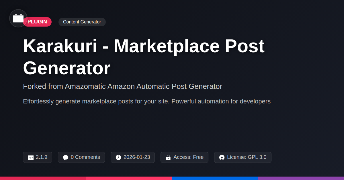 You've seen the light, haven't you? The dazzling, automated, sanity-saving light of Karakuri. For too long, we’ve accepted the drudgery of manual product posting as an unfortunate byproduct of running an online venture. We’ve accepted late nights fueled by lukewarm coffee and the soul-crushing monotony of copy-pasting. But then came Karakuri, a solution that understands the developer’s mind, the agency’s hustle, and the open-source lover's appreciation for elegant, adaptable tools. It’s not just about generating posts; it’s about reclaiming your most precious resource: time. Think about it. That time you would have spent wrestling with product descriptions can now be dedicated to crafting that groundbreaking new feature, strategizing your next big campaign, or perhaps even, dare we say it, enjoying a guilt-free afternoon off. Karakuri provides the robust foundation you need, inherited from a proven lineage, but with the flexibility that only an open, adaptable approach can offer. It’s a tool built for those who understand the value of efficiency and the power of smart automation. You're not just buying a plugin; you're investing in your productivity, your sanity, and the growth of your digital empire. So ditch the spreadsheets, silence the endless copy-paste commands, and embrace the future of content generation. Let Karakuri handle the grunt work, so you can focus on what you do best: building, innovating, and a little bit of enjoying the fruits of your labor. The automated marketplace is here. Are you ready to lead the charge?