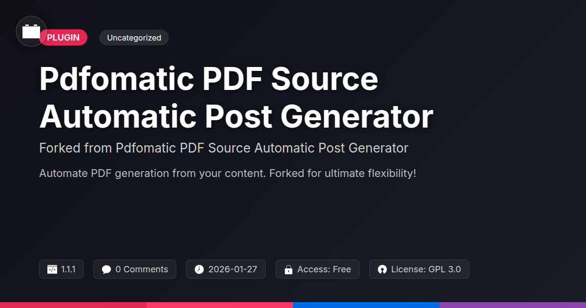 GrootMade is NOT affiliated with Pdfomatic PDF Source Automatic Post Generator or its original author. Pdfomatic PDF Source Automatic Post Generator™ is a trademark of its respective owner and use of it does not imply any endorsement or affiliation. This product has been forked under the GNU General Public License (GPL) and all non-GPL assets (such as proprietary images, fonts, and branding) have been removed. Distributing GPL-licensed code is 100% legal.
