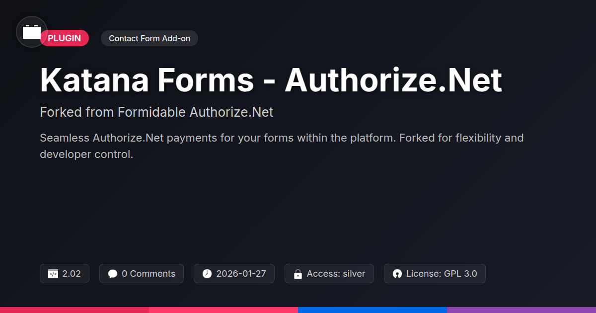 GrootMade is NOT affiliated with Formidable Authorize.Net or its original author. Formidable Authorize.Net™ is a trademark of its respective owner and use of it does not imply any endorsement or affiliation. This product has been forked under the GNU General Public License (GPL) and all non-GPL assets (such as proprietary images, fonts, and branding) have been removed. Distributing GPL-licensed code is 100% legal.