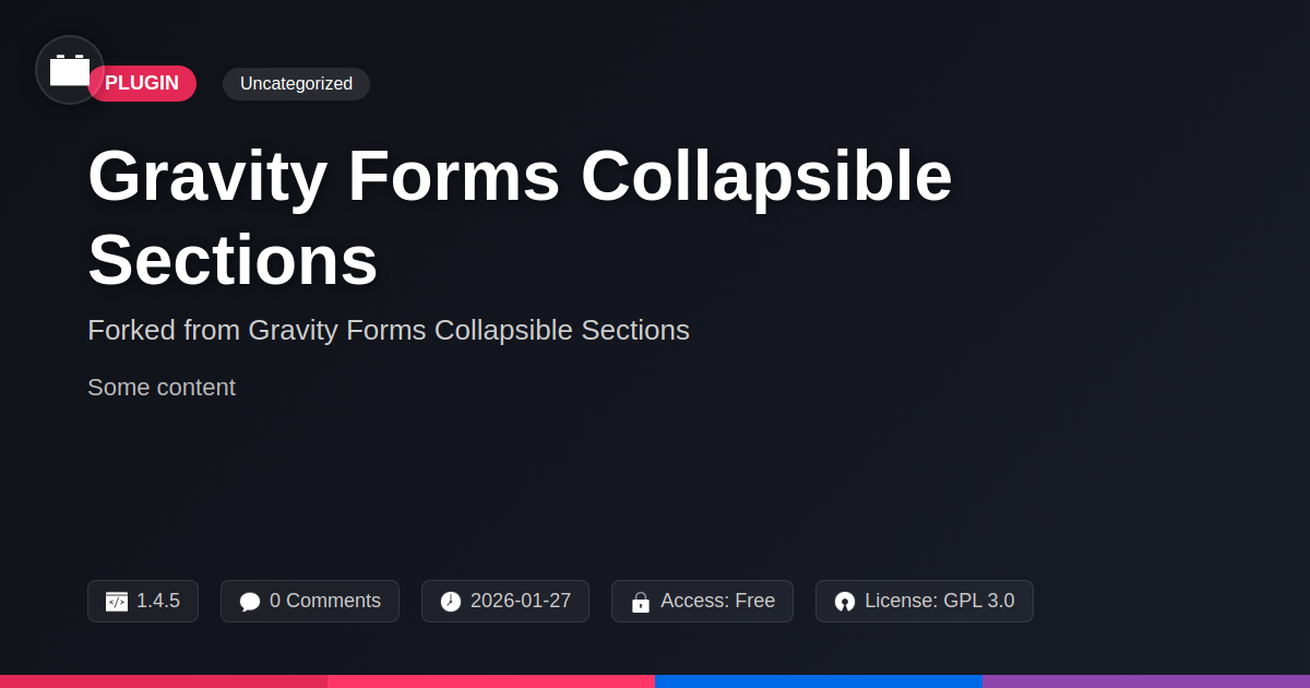 GrootMade is NOT affiliated with Gravity Forms Collapsible Sections or its original author. Gravity Forms Collapsible Sections™ is a trademark of its respective owner and use of it does not imply any endorsement or affiliation. This product has been forked under the GNU General Public License (GPL) and all non-GPL assets (such as proprietary images, fonts, and branding) have been removed. Distributing GPL-licensed code is 100% legal.