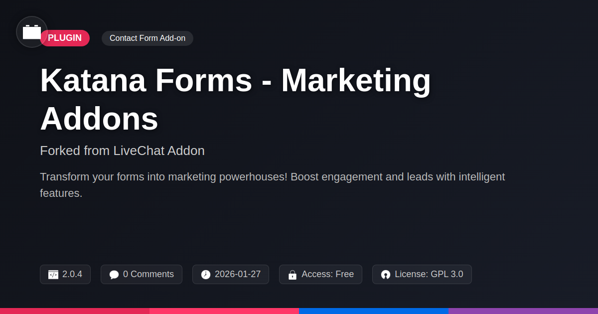 So, let's cut to the chase. Your website is a digital storefront, and your forms are the friendly greeters. But if those greeters are just standing there, handing out generic flyers instead of actively engaging visitors and guiding them towards a purchase (or whatever your conversion goal may be), you're leaving a boatload of potential on the table. We've all been there – the endless spreadsheets, the frantic copy-pasting, the vague hope that your lead data will magically organize itself. It's the digital equivalent of herd the cattle with a butterfly net. Katana Forms - Marketing Addons isn't just another form plugin; it's your secret weapon for turning passive data collection into an active, intelligent marketing engine. For developers and agencies, this means less grunt work and more time building awesome solutions that genuinely impress clients. For the open-source enthusiasts, it's about leveraging powerful, flexible tools to build truly custom experiences. It’s about smart integrations that talk to your other marketing tools, about segmenting your audience with the precision of a neurosurgeon, and about automation that actually automates things instead of just creating more work. Imagine a world where your forms don't just collect emails, but actively qualify leads, nurture prospects, and seamlessly feed your CRM. That's not a pipe dream; that's what Katana Forms - Marketing Addons is built to deliver. Stop settling for forms that are as exciting as beige wallpaper and start building a marketing powerhouse. Your leads, your clients, and your sanity will thank you.