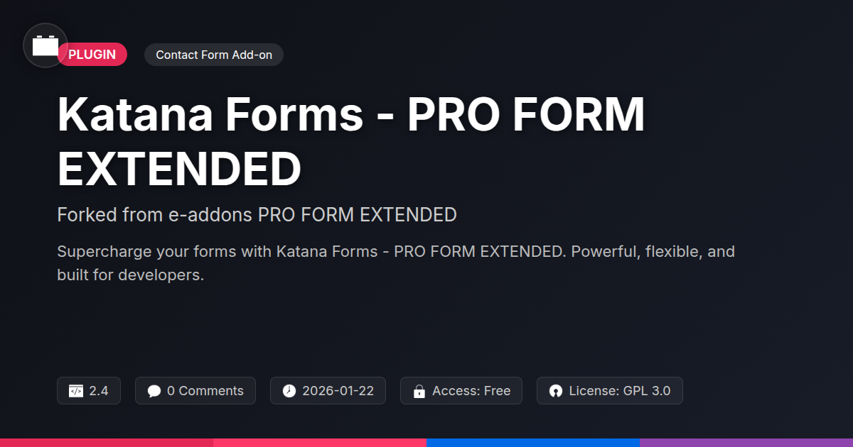 GrootMade is NOT affiliated with e-addons PRO FORM EXTENDED or its original author. e-addons PRO FORM EXTENDED™ is a trademark of its respective owner and use of it does not imply any endorsement or affiliation. This product has been forked under the GNU General Public License (GPL) and all non-GPL assets (such as proprietary images, fonts, and branding) have been removed. Distributing GPL-licensed code is 100% legal.