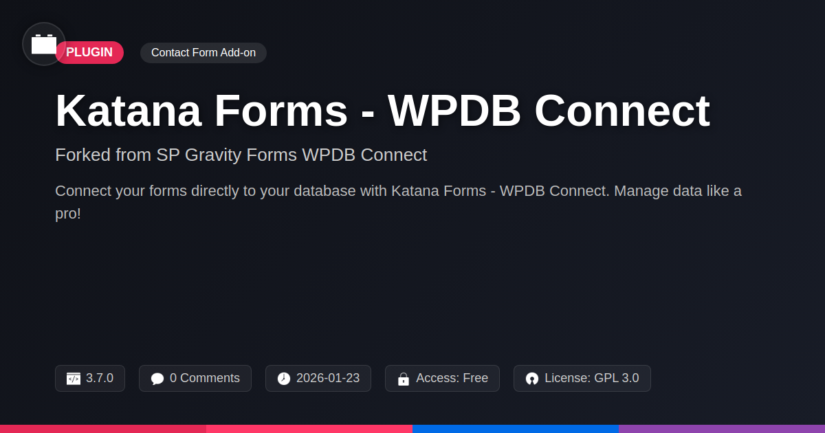 The manual data handling chaos ends now. Katana Forms - WPDB Connect offers elegant control. It precisely bridges your form submissions directly to your database. Think of it as a dedicated conduit. This tool ensures your submitted data lives where it belongs. Developers and agencies gain serious power. It’s built for those who need direct database interaction. This offers seamless data flow. Its foundation is a robust, well-tested fork. This heritage means mature, reliable technology. It's the straightforward solution you've been seeking. Unlock efficient data management. Experience direct WPDB connection. This is advanced functionality made accessible.