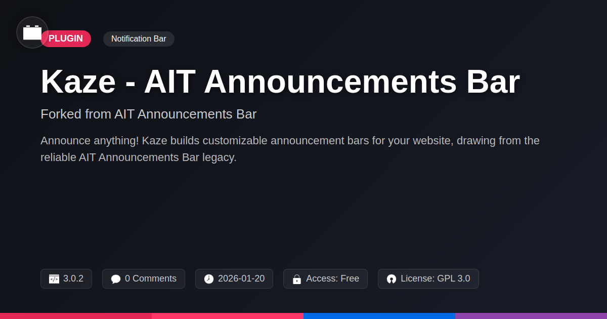 This is where Kaze swoops in, a rather spiffy fork of the well-regarded AIT Announcements Bar, here to rescue your most important tidbits from the land of the forgotten. Think of it as your website's own personal megaphonist, strategically placed at the top, ensuring your visitors can't possibly miss what you have to say. For the discerning developer, the agency wrangling client demands, or the hard-core open-source aficionado who appreciates a well-crafted, adaptable tool – Kaze is your new best friend. It’s built for those who understand that communication isn't just about sending a message; it's about ensuring it's received. We're talking about a tool that’s robust, flexible, and (dare we say) a little bit fun to wield. No more hunting for the perfect, unobtrusive yet unmissable spot. No more wrestling with clunky interfaces. Kaze is here to make your announcements sing, or at least hum a catchy tune that gets noticed. Ready to upgrade your site's whisper campaign to a well-articulated announcement?