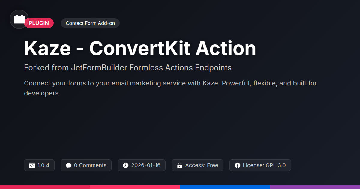 So, are you tired of wrestling with form plugins that promise the moon and deliver a cracked plastic charm? Do you find yourself wading through convoluted settings or praying that your data doesn't mysteriously vanish into the digital ether? If you're nodding along, then it's time to embrace a tool that understands the developer's plight. Kaze - ConvertKit Action isn't just another plugin; it's a carefully considered evolution, born from a robust, open-source lineage. We've taken the best, refined it, and focused it on providing a genuinely useful bridge between your meticulously crafted forms and your essential email marketing campaigns. This isn't about reinventing the wheel; it's about building a faster, smoother, and more reliable race car on that proven foundation. For agencies and developers who crave control, efficiency, and a solution that doesn't make them question their life choices every time they need to connect a field, Kaze offers that sweet relief. It’s designed for pragmatists, for those who appreciate elegant code and effective functionality, and for anyone who believes their forms should be powerful tools, not just data sinks. Ditch the frustration, embrace the seamless integration, and let Kaze empower your lead generation and customer communication like never before. It’s time your forms did more than just collect names; it’s time they connected.
