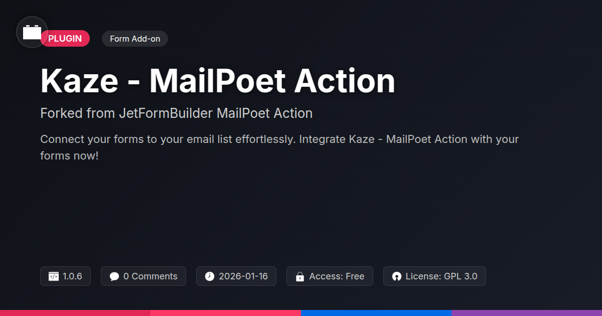 So, there you have it. Kaze - MailPoet Action: the plugin equivalent of finding a perfectly ripe avocado in a sea of green, rock-hard disappointments. We've navigated the treacherous waters of form-to-email integration, and by golly, we've emerged with a solution that doesn't require a sacrificial offering to the plugin gods or a degree in advanced troubleshooting. For the developers out there meticulously crafting digital experiences, this tool is your new favorite assistant, silently ensuring that every lead generated from your brilliant forms finds its way to the right inbox, without a hiccup. No more manual data entry that makes you question your life choices. No more fear of a plugin update breaking your carefully constructed workflow. And for those agencies out there juggling multiple clients and even more plugins, imagine the sheer bliss of a streamlined, reliable integration. It’s the kind of thing that makes clients smile and your project managers sleep soundly at night. Plus, being a fork of a robust original, it carries that legacy of quality while carving its own path. It’s the best of both worlds: proven functionality with the promise of an open, adaptable future. So, ditch the duct tape solutions and the overflowing support queues. Embrace the elegance, the efficiency, and yes, even the subtle humor that Kaze - MailPoet Action brings to the table. It’s time to let your forms do the heavy lifting, and your email marketing sing. Go forth and integrate, you magnificent code slingers and agency wizards!