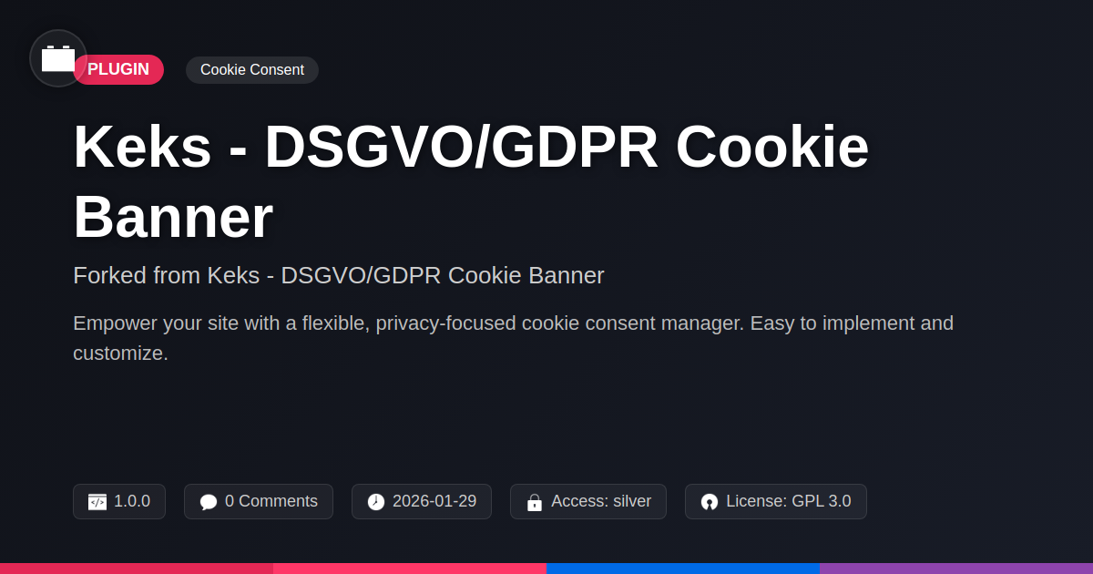 GrootMade is NOT affiliated with Keks - DSGVO/GDPR Cookie Banner or its original author. Keks - DSGVO/GDPR Cookie Banner™ is a trademark of its respective owner and use of it does not imply any endorsement or affiliation. This product has been forked under the GNU General Public License (GPL) and all non-GPL assets (such as proprietary images, fonts, and branding) have been removed. Distributing GPL-licensed code is 100% legal.