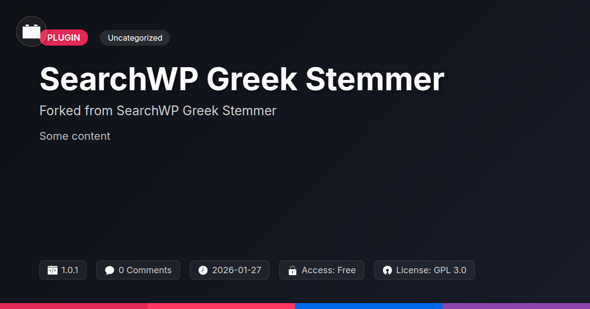 GrootMade is NOT affiliated with SearchWP Greek Stemmer or its original author. SearchWP Greek Stemmer™ is a trademark of its respective owner and use of it does not imply any endorsement or affiliation. This product has been forked under the GNU General Public License (GPL) and all non-GPL assets (such as proprietary images, fonts, and branding) have been removed. Distributing GPL-licensed code is 100% legal.