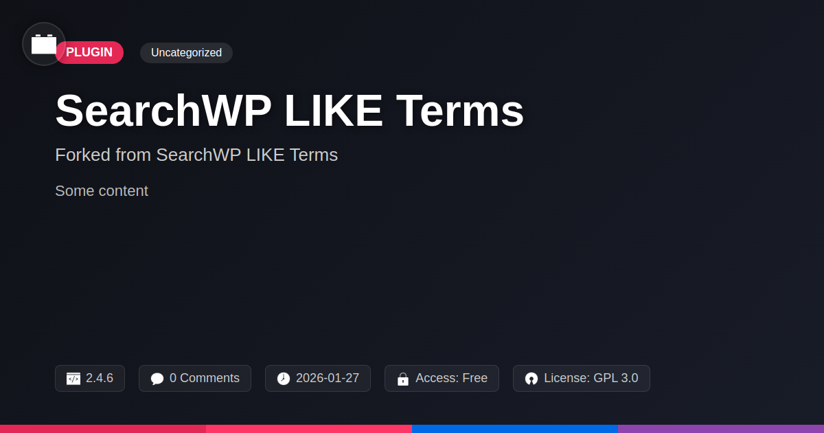 GrootMade is NOT affiliated with SearchWP LIKE Terms or its original author. SearchWP LIKE Terms™ is a trademark of its respective owner and use of it does not imply any endorsement or affiliation. This product has been forked under the GNU General Public License (GPL) and all non-GPL assets (such as proprietary images, fonts, and branding) have been removed. Distributing GPL-licensed code is 100% legal.