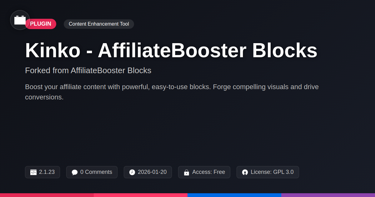 GrootMade is NOT affiliated with AffiliateBooster Blocks or its original author. AffiliateBooster Blocks™ is a trademark of its respective owner and use of it does not imply any endorsement or affiliation. This product has been forked under the GNU General Public License (GPL) and all non-GPL assets (such as proprietary images, fonts, and branding) have been removed. Distributing GPL-licensed code is 100% legal.