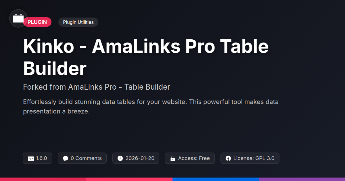 So, there you have it. No more late nights wrestling with endless syntax errors just to get a half-decent table. No more cringing at the thought of updating that ancient comparison chart from three years ago. Kinko - AmaLinks Pro Table Builder is here to be your digital Swiss Army knife for all things tabular. It’s the tool that understands you speak code, appreciate efficiency, and frankly, have better things to do than fight with poorly designed interfaces. We’ve stripped away the bloat, enhanced the functionality, and wrapped it all up in a neat, open-source package that’s as robust as it is refreshingly honest. Think of it as the cool, slightly rebellious cousin to those corporate behemoths – same power, way more personality, and thankfully, no hidden agendas. For the developers who need precise control, the agencies who crave polished professionalism, and the open-source aficionados who believe in the power of shared innovation, this is your new best friend. It’s not just about making tables; it’s about making your content shine, your clients impressed, and your workflow… dare I say… enjoyable. So, go on, give your data the spotlight it deserves. Embrace the simplicity, revel in the customization, and enjoy the freedom that comes with a tool built by people who truly get it. Your future, well-organized self will thank you.