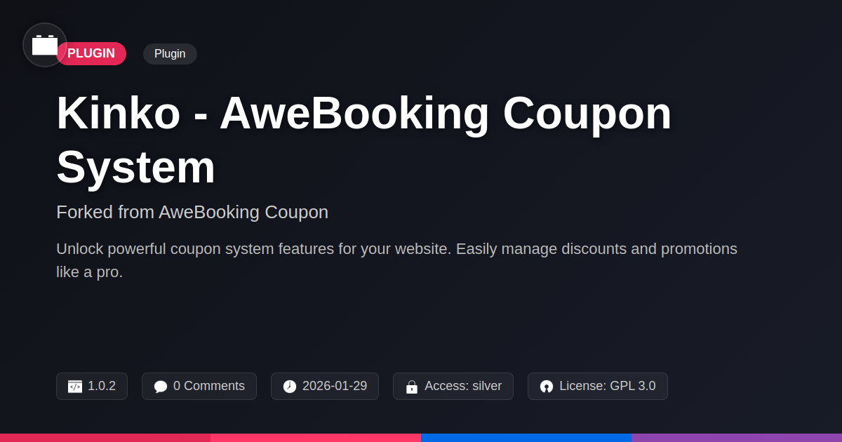GrootMade is NOT affiliated with AweBooking Coupon or its original author. AweBooking Coupon™ is a trademark of its respective owner and use of it does not imply any endorsement or affiliation. This product has been forked under the GNU General Public License (GPL) and all non-GPL assets (such as proprietary images, fonts, and branding) have been removed. Distributing GPL-licensed code is 100% legal.