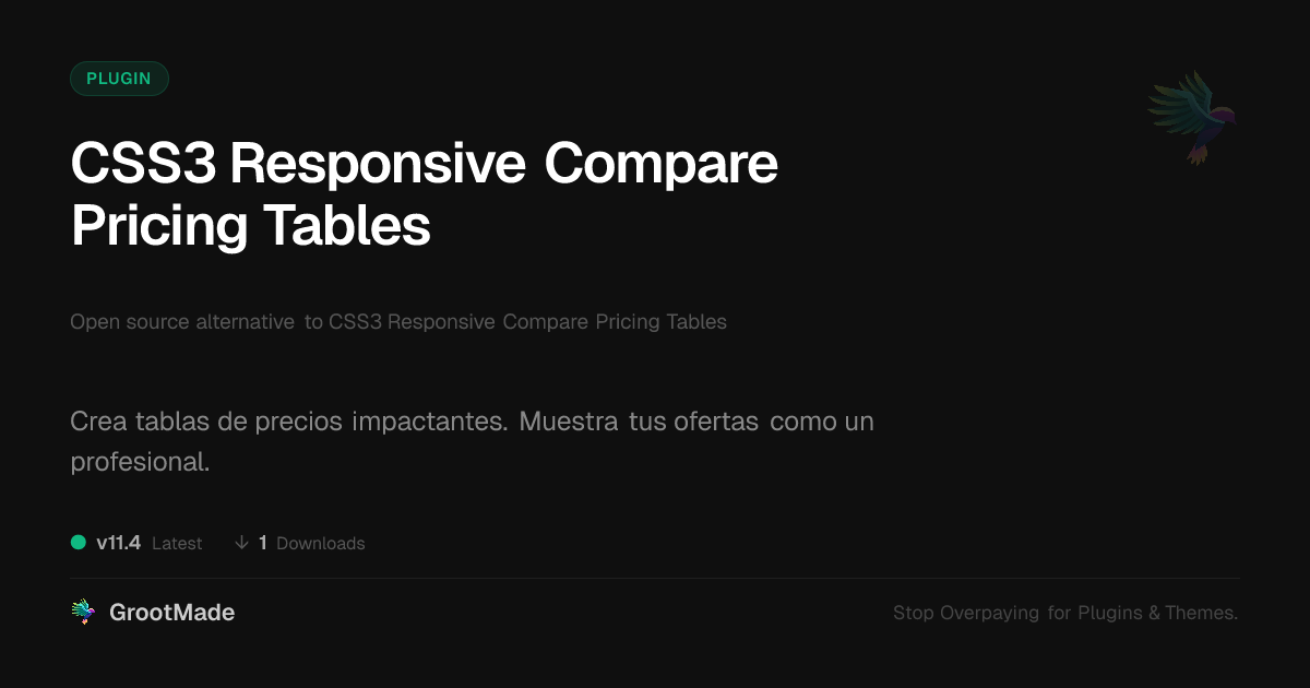 GrootMade is NOT affiliated with CSS3 Responsive Compare Pricing Tables or its original author. CSS3 Responsive Compare Pricing Tables™ is a trademark of its respective owner and use of it does not imply any endorsement or affiliation. This product has been forked under the GNU General Public License (GPL) and all non-GPL assets (such as proprietary images, fonts, and branding) have been removed. Distributing GPL-licensed code is 100% legal.