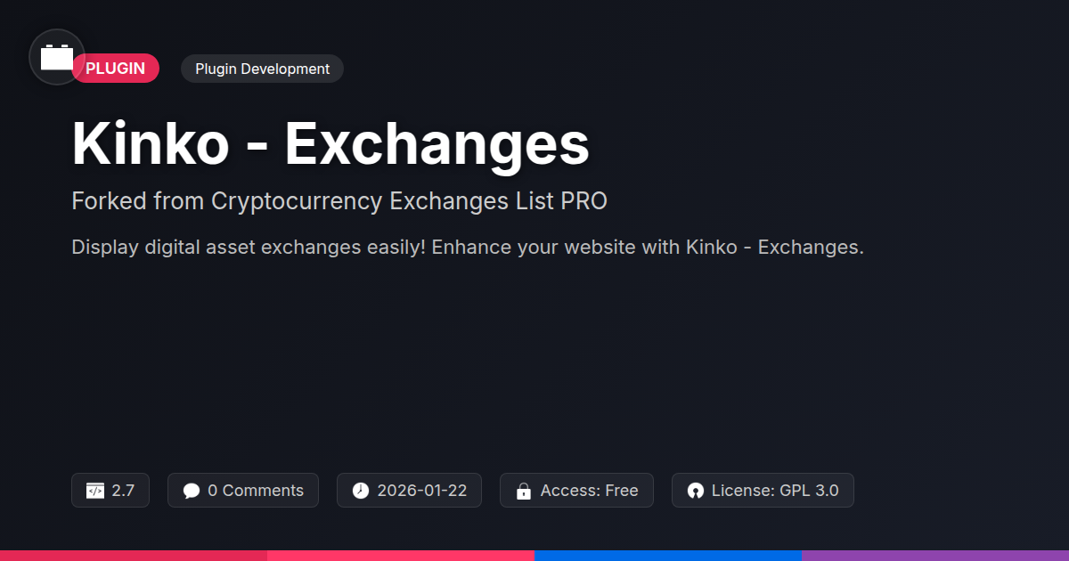 Tired of cobbling together that crypto exchange data yourself, or worse, relying onThat sketchy third-party service that looks like it was built in 2005? Let's be honest, your website deserves better. You're a developer, a builder of digital empires (or at least, really cool websites), and you need tools that work. Tools that don't make you question your life choices. That's where Kinko - Exchanges slithers in, a fork from a project that understood the pain. It's designed to be your go-to solution for slickly displaying information about cryptocurrency exchanges. No more wrestling with APIs late into the night, no more explaining to clients why that 'list' looks like it was designed by a hamster on a keyboard. This is about taking a solid foundation and making it shine, offering you the flexibility and control you crave. Whether you're building a financial news portal, a comparison site, or just want to flex your crypto knowledge, Kinko - Exchanges aims to be your secret weapon. We're talking about a tool that's built for the discerning eye, the kind that appreciates clean code and even cleaner data presentation. Forget the limitations of lesser tools; it's time to elevate your game. This isn't just another plugin; it's a commitment to quality, performance, and not having to explain why your ticker looks like a pixelated mess. So, buckle up, because we're about to dive into how Kinko - Exchanges can make your life easier and your projects significantly more impressive. Because let's face it, you have better things to do than reinvent the wheel, especially when that wheel is powered by blockchain.