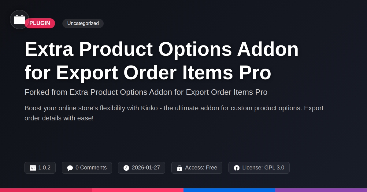 GrootMade is NOT affiliated with Extra Product Options Addon for Export Order Items Pro or its original author. Extra Product Options Addon for Export Order Items Pro™ is a trademark of its respective owner and use of it does not imply any endorsement or affiliation. This product has been forked under the GNU General Public License (GPL) and all non-GPL assets (such as proprietary images, fonts, and branding) have been removed. Distributing GPL-licensed code is 100% legal.