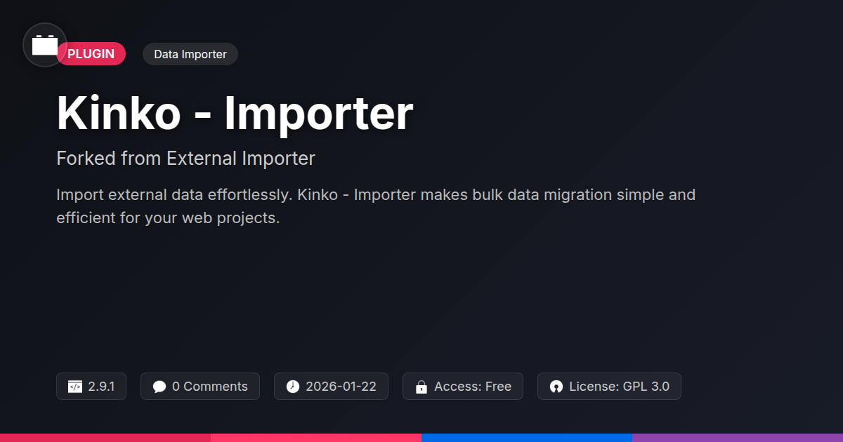 Ever stared at a mountain of data, spreadsheets, or confusing external feeds, only to realize the only way to get it into your site is by the sheer power of manual entry… and maybe a few tears? Yeah, we've all been there. It’s the digital equivalent of trying to herd cats, blindfolded, uphill. But what if there was a tool that could take that overwhelming data import task and turn it into something less soul-crushing, maybe even… dare we say it… easy? Imagine a world where your external data doesn't just sit there mocking you, but instead seamlessly integrates into your online presence. We’re talking about taking that CSV file that looks like hieroglyphics and having it magically become beautiful posts, products, or user profiles. Does such a mythical creature exist in the often-bewildering land of web development? Well, pull up a chair and let us introduce you to Kinko - Importer. It’s not just another glorified copy-paste button; it’s your new best friend for taming the wild west of data migration, built with folks like you – the creators, the builders, the open-source aficionados – in mind. Get ready to say goodbye to tedious manual uploads and hello to controlled, efficient data population. Your sanity (and your carpal tunnel) will thank you.