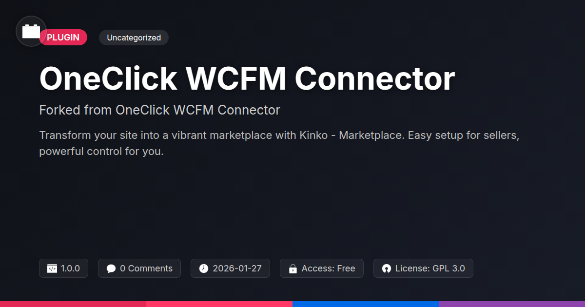 GrootMade is NOT affiliated with OneClick WCFM Connector or its original author. OneClick WCFM Connector™ is a trademark of its respective owner and use of it does not imply any endorsement or affiliation. This product has been forked under the GNU General Public License (GPL) and all non-GPL assets (such as proprietary images, fonts, and branding) have been removed. Distributing GPL-licensed code is 100% legal.