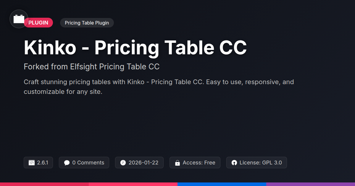 So, there you have it. We’ve navigated the treacherous waters of pricing page design and emerged victorious, armed with Kinko - Pricing Table CC. You’re no longer doomed to create tables that bore your visitors into submission or leave you pulling out your hair in frustration. This isn't just another plugin; it's your new secret weapon for turning browsing visitors into paying customers. Remember all those times you wished for a drag-and-drop miracle that actually worked, or a design that didn’t require selling a kidney to afford a designer? Kinko - Pricing Table CC is that miracle, minus the questionable sourcing and inflated price tags. It’s built for folks like you – the developers who value clean code, the agencies who crave client satisfaction, and the open-source aficionados who appreciate a solid, evolving foundation. You can now build visually stunning, lightning-fast, and highly effective pricing tables with a level of ease that might just make you giggle. Stop settling for mediocre. It’s time to elevate your pricing, impress your clients, and most importantly, make your website work harder for you. Go forth and create pricing tables that don't just list features, they sell dreams.