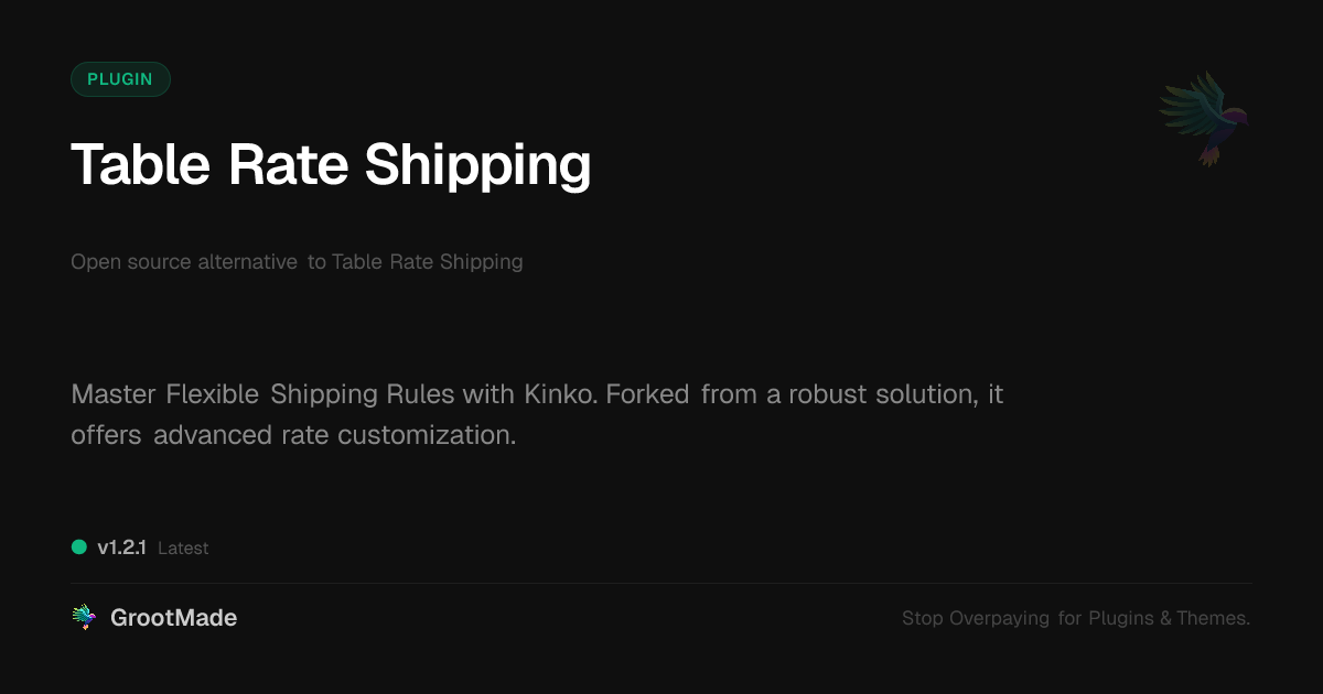 GrootMade is NOT affiliated with Table Rate Shipping or its original author. Table Rate Shipping™ is a trademark of its respective owner and use of it does not imply any endorsement or affiliation. This product has been forked under the GNU General Public License (GPL) and all non-GPL assets (such as proprietary images, fonts, and branding) have been removed. Distributing GPL-licensed code is 100% legal.
