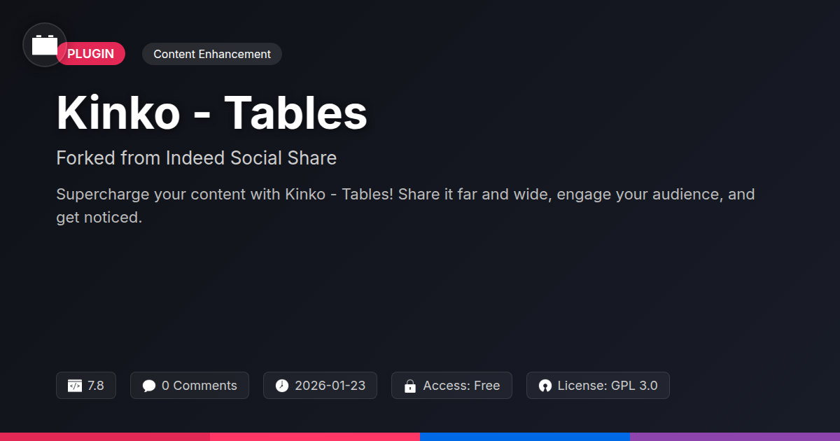 Kinko - Tables isn't just another content sharing solution. It's a labor of love. Born from a respected open source web tools fork, its DNA is pure quality. We understand the developer community. We built a Kinko - Tables plugin for users like us. You crave robust functionality. You value transparency. Our commitment shines through. This isn't a black box. It’s a tool crafted with care. Experience true premium plugin features. Enhance your content sharing efforts. Join our growing developer community. Stop settling for less. Get Kinko - Tables. Your website will thank you. Probably.