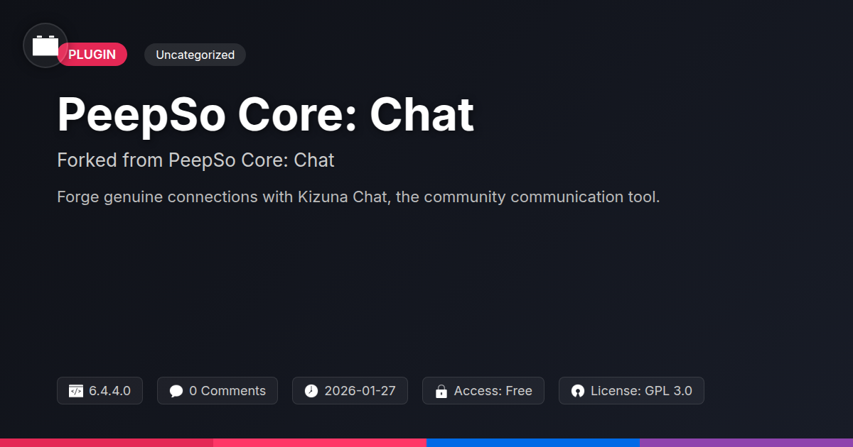 GrootMade is NOT affiliated with PeepSo Core: Chat or its original author. PeepSo Core: Chat™ is a trademark of its respective owner and use of it does not imply any endorsement or affiliation. This product has been forked under the GNU General Public License (GPL) and all non-GPL assets (such as proprietary images, fonts, and branding) have been removed. Distributing GPL-licensed code is 100% legal.